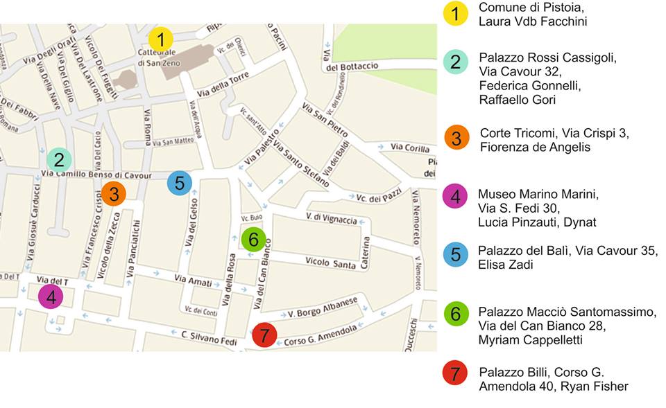 Un percorso d’arte contemporanea che partendo dall’atrio del Palazzo del Comune di Pistoia giunge al Museo Marino Marini, attraverso androni e cortili di cinque palazzi storici privati pistoiesi: Palazzo del Balì, Corte Tricomi, Palazzo Rossi Cassigoli, Palazzo Billi, Palazzo di via del Canbianco 28. A cura della storica dell’arte Ilaria Magni.